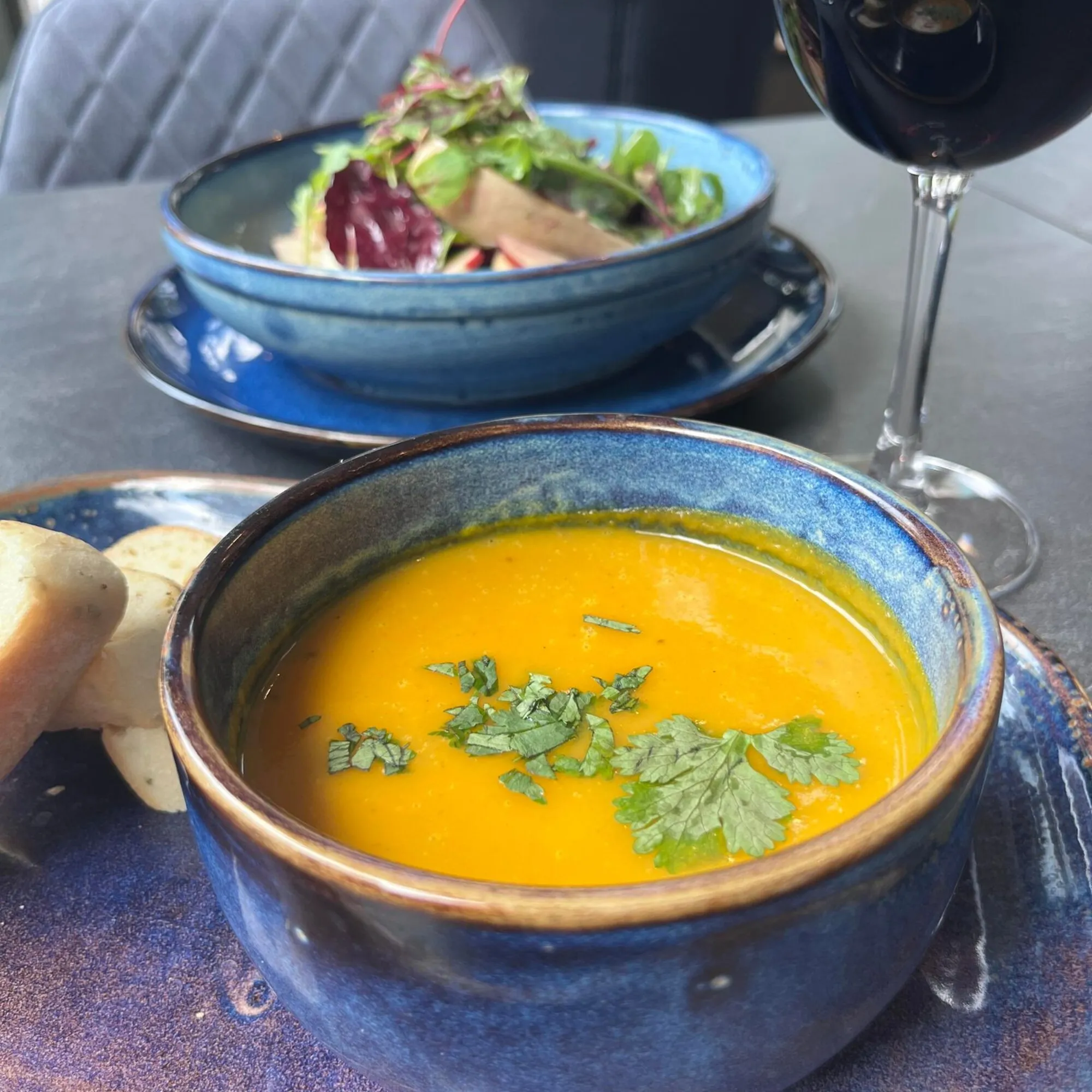 To kick things off, the Carrot and Coriander Soup with rosemary focaccia is the perfect autumn warmer. The fragrant coriander enhances the carrot's natural sweetness, while the rosemary focaccia is perfect for dipping.